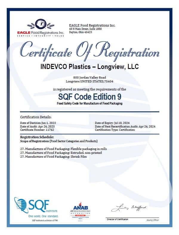 INDEVCO Packaging Solutions manufactures sustainable packaging for processed and bulk foods that require barrier and non-barrier properties, grease resistance, and oven and microwave-ability. Our INDEVCO North America Longview plant in Texas, through its Safe Quality Food Institute SQF Code 9 Certification, adheres to a comprehensive set of protocols and guidelines designed to ensure the safety and integrity of food packaging materials and to protect consumers.